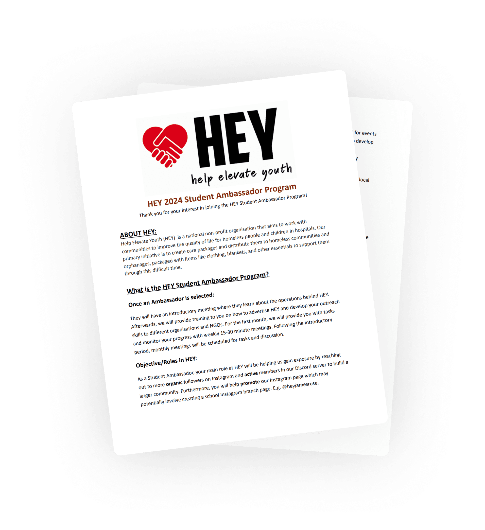 HEY Student Ambassadors will work alongside closely with the HEY Partnerships Director to represent HEY within their school or local communities. Student Ambassadors will be offered guidance and advice to create and establish a club within their school/community, ultimately fundraising money and developing programs that will support underprivileged individuals. Student Ambassadors will also have the opportunity to develop their own initiatives and innovative solutions within their local community that aligns with HEY’s organisational mission, and will have the freedom to decide the goals and direction of their chapter.